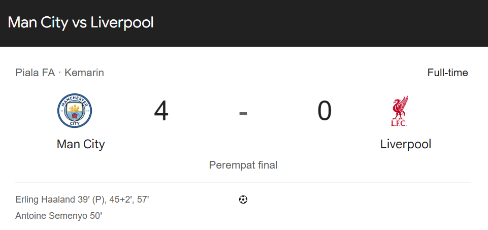 Kemenangan gemilang The Citizens ini tidak lepas dari penampilan luar biasa sang mesin gol, Erling Haaland, yang sukses mencetak hattrick.