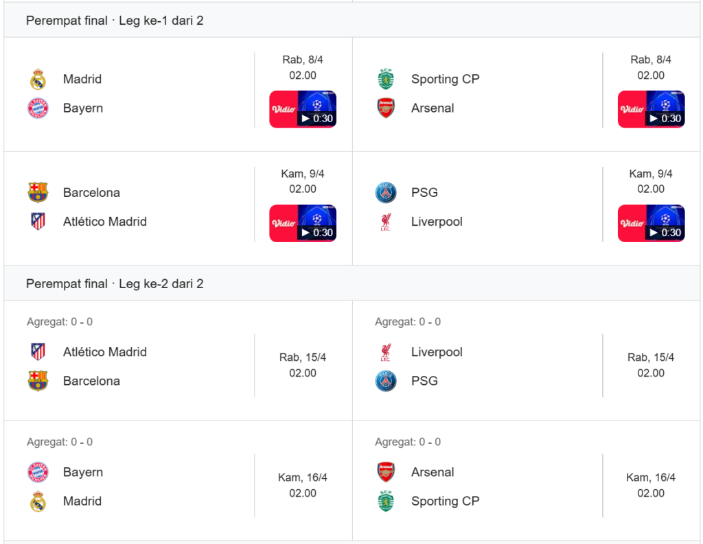 Delapan tim terbaik benua biru siap bertarung habis-habisan dalam dua leg yang dijadwalkan berlangsung pada 8–9 April untuk leg pertama dan 15–16 April untuk leg kedua, pukul 02.00 WIB.